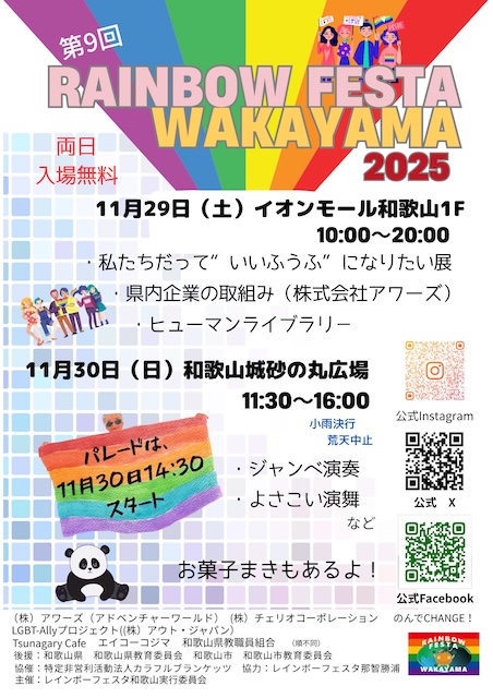 今年もレインボーフェスタが和歌山市で開催されます。1日目はイオンモール和歌山でのポップアップイベント、2日目が和歌山城 砂の丸広場を会場とするフェスタと、和歌山城を一周するかたちのパレードです。