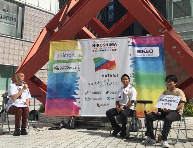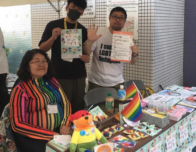 それから、遠藤まめたさん(一般社団法人にじーず代表)と當山敦己さん(一般社団法人ここいろhiroshima共同代表)、河口和也さん(ひろしまプライドパレード共同実行委員長・広島修道大学教授)が登壇し、「ユース支援について」というテーマでトークセッションが行なわれました。若い世代で学校でも家庭でも自分を出せない状況はまだまだある、教師の中には研修を受けても自分の生徒にはLGBTQ+の生徒はいないという人がいる、など、地方の現実の厳しさが話し合われました。遠藤まめたさんは「今回こそ学習指導要領にLGBTを」と書いたプラカードを持っていました(遠藤さんは以前から性の多様性を無視した学習指導要領を変えるための運動を展開してきました)