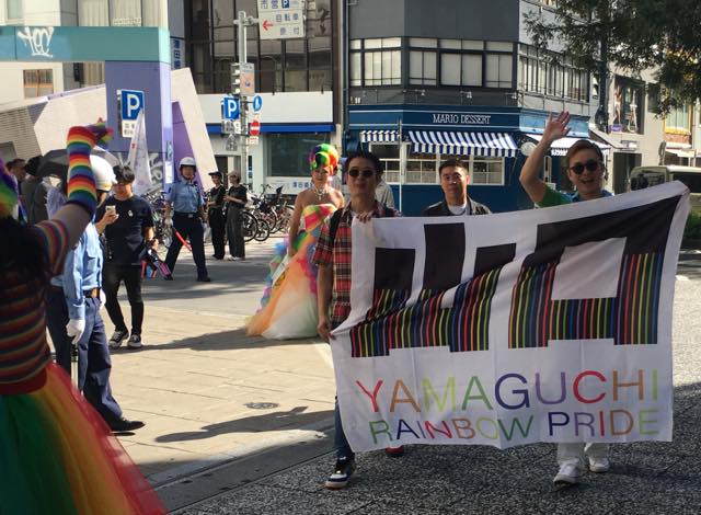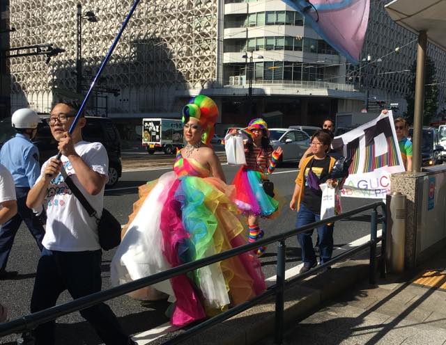 先頭には横断幕を持った河口さん、木谷さん、木下さん。その後ろに福正さん、ぽんつくさん、ご家族の方が続きます。えひめプライドのさとしぃさん、香川レインボーパレードの藤田さん、MARRIAGE FOR ALL JAPANのみなさんも歩いていました。レインボーのハートのバルーンやいろんなセクシュアリティのフラッグ、「一緒に法律を変えよう」「みんなが選べるように、私たちも選びたい」と同性婚実現を訴えるプラカードを持った方もいました。呉市の団体「いろいろくれし」のみなさん、山口レインボープライドのみなさん、Transgender Japanの村田さん、エクシオグループ、資生堂、NTTグループ、明治の社内LGBTQ+アライネットワーク「Marble」、司法書士会、日本LGBTサポート協会の方々などはグループで参加していました。大阪から産婦人科医の藤田さん、姫路からそらにじひめじのダイスケさん、全国のパレードに参加しているアライのあきおさん、のもとさん、木谷さんのお姉様も参加していました。お名前はわかりませんが、レインボーカラーの豪華なドレスを着たドラァグクイーンの方も参加していました。金座商店街では、沿道からたくさんの方がフラッグを持ってパレードを待っていてくれました。