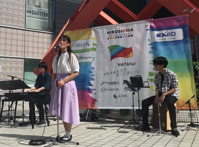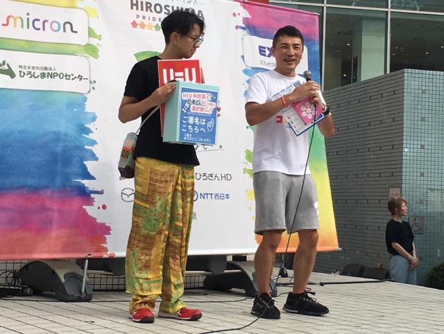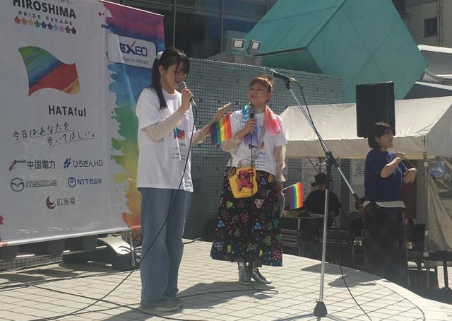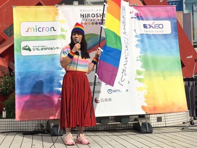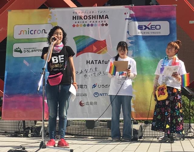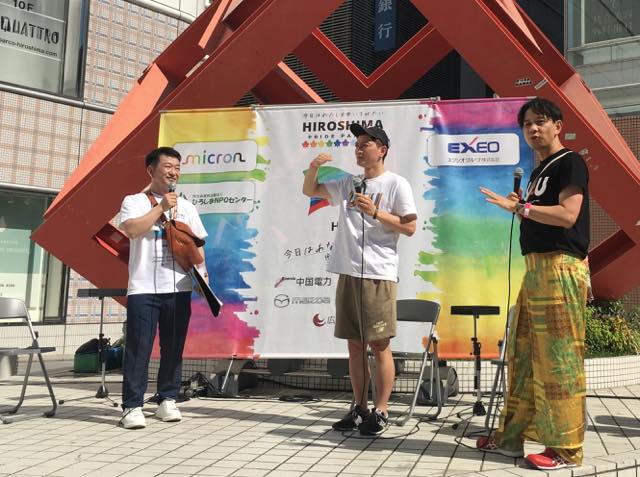 共同実行委員長であり発起人でもあるイチさんが開会宣言をして、ひろしまプライドパレードを開催した経緯などをお話しました。一度は離れた広島でしたが、東京や他県のパレードに参加し、地元広島でも開催したいと思ったそうです。広島でかつてのイチさんのようにセクシュアリティで悩んでいる人に、パレードを歩いている人の姿が見えるだけで勇気づけられることがあるのではないかという期待があったそうです。イチさんの写真は掲載していません。お顔出しができないという状況は、今の広島を、そして日本の地方の現状を映し出していると思います。でも、たとえ顔は出せなくてもこうしてパレードを主催し、声を上げるというのは素晴らしいことだと思いました。