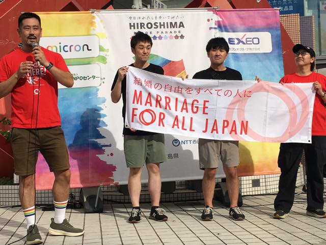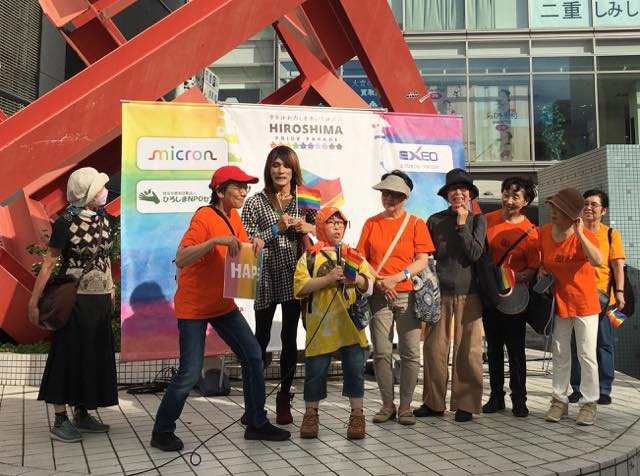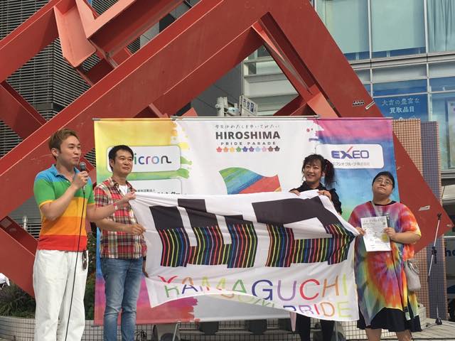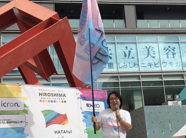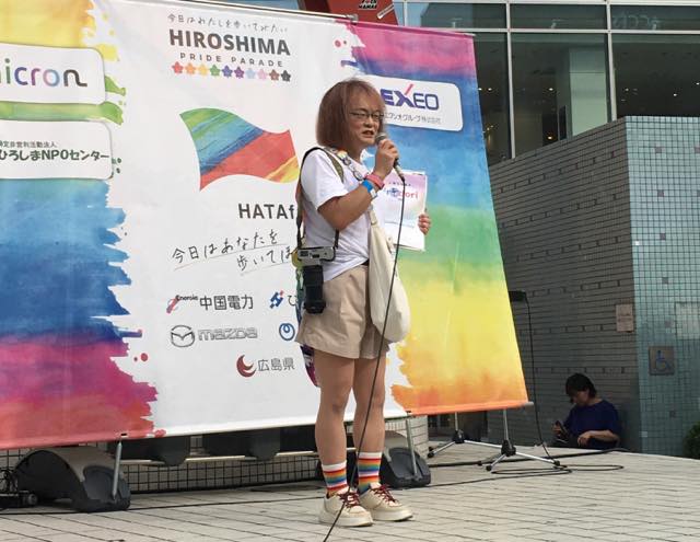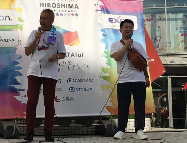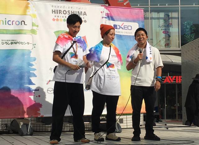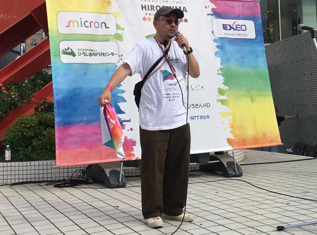 そして閉会のあいさつです。最初はイチさんから参加者の方たちへのお礼のスピーチ。パレードが無事に終わった「今」の感慨を語り、感極まっている様子でした。そして、実行委員長の河口さん、事務局長の木谷さんからごあいさつがあり、初開催のひろしまプライドパレードは閉幕しました。