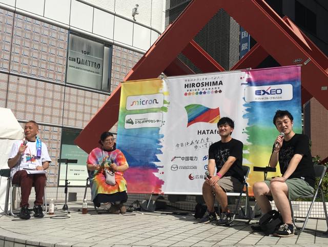 続くトークセッションは「HIV陽性者とHIV陰性者カップルの暮らし」がテーマ。広島出身の福正大輔さんさん&ぽんつくさんのカップルと、ひろしまプライドパレード事務局長の木谷さんが登壇しました。あまり聞けない陽性者と陰性者のカップルの生活。ぽんつくさんは薬を飲み忘れないように大輔さんに声をかけたりしているそうです。ほかにもU=UのことやPrEPのこと、映画『カミングアウトジャーニー』のことなども話されました。