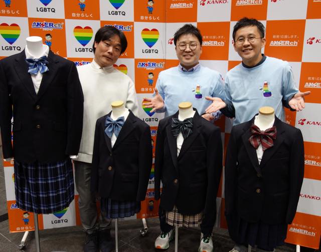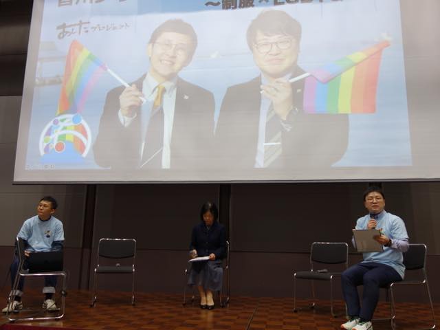 最初のトークセッションは「制服×LGBTQ+」。あしたプロジェクトの代表の谷さん、副代表の福井さん、一社)教育コミュニティの三木さんが登壇しました。あしたプロジェクトは香川県のトランス男性2人が中心となり、香川県の教育現場や企業、医療機関などに向けて講演会や研修会を行なったり、学校の制服の問題について活動したりしてきた団体です。以前の岡山レインボーフェスタでも壇上で制服を持って訴えていた姿が印象に残っています。福井さんは小学校に上がる前から性別違和を抱いてきたと、谷さんは学校に通う間、毎日が挫折だったと自身の体験を語っていました(福井さんは、セーラー服を着て悲しそうにしている写真なども見せていました)。香川県では全ての学校が(小学校も全部)制服なんだそうですが、男子は詰襟の学ラン、女子はセーラー服と決められるよりも、選択の幅があるブレザーのほうがいいなど、ジェンダーにかかわらず着やすい標準服についてさまざまなお話が繰り広げられました。