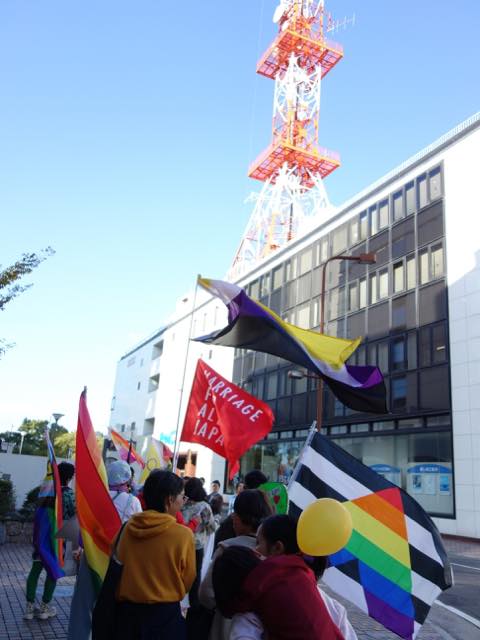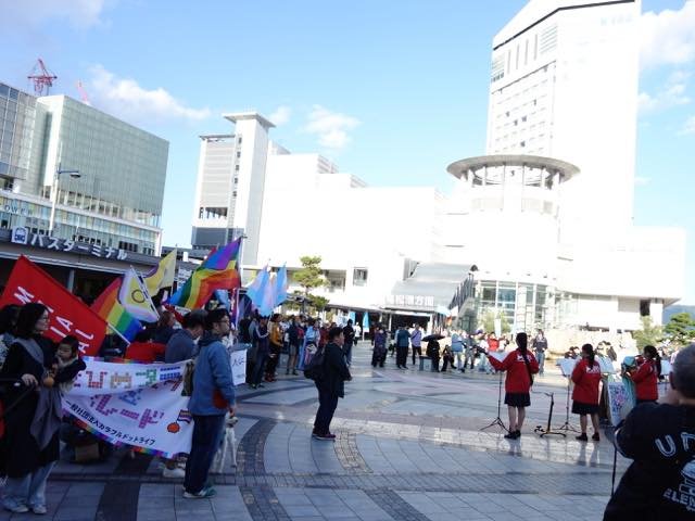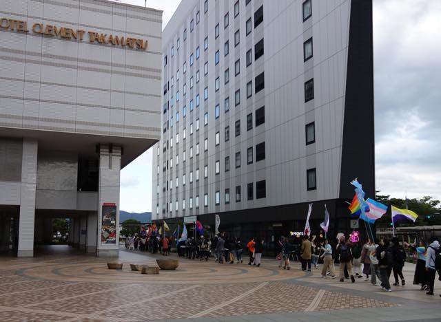 そうして岡山レインボーフェスタの翌日の11月3日(月祝)、香川プライドパレードが初開催されました(すぐ近くの街で1日違いで開催されたのは本当によかったです。おかげで両方とも取材できました)。11時半、高松駅前の、たぶん市内でも有数の高層ビルではないかと思われるシンボルタワーの1階にある多目的ホールが会場となりました。