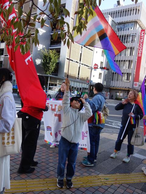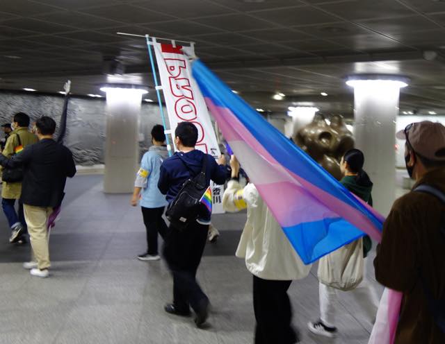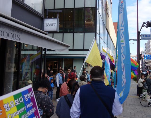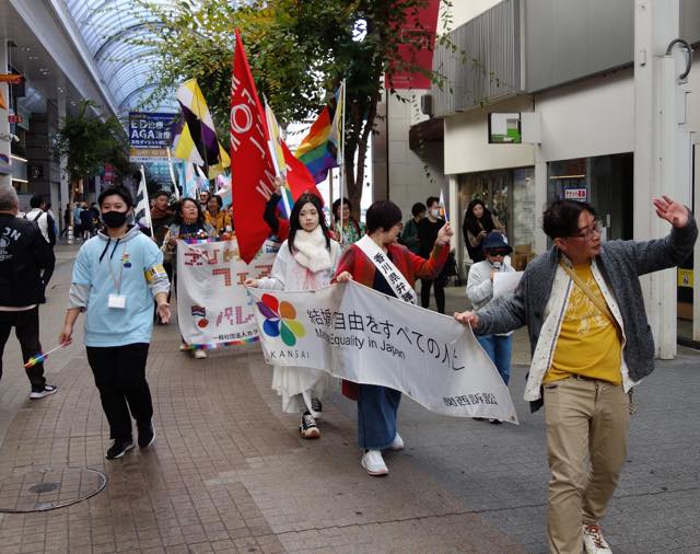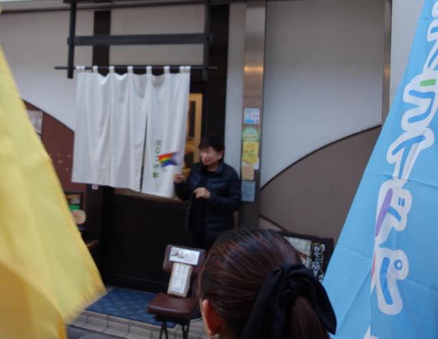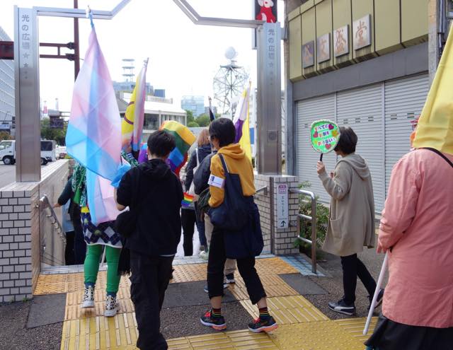 国道30号線沿いに南下し、中央公園の交差点のところで階段を降り、金色のオブジェがある光の広場を通って再び地上に出て、国道11号線沿いに東に進み、ライオン通商店街に入りました。お店の前に出てレインボーフラッグを振ってくれる方もいたり。逆に商店街にいた方たちのなかには怪訝そうな顔で見ている方もいたり。昭和を感じさせるお店がたくさんあって、趣がある商店街でした。