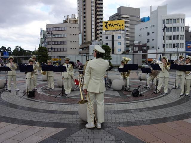 演奏が終わると、駅前広場から大きなホテルの横を通って高松城や琴電高松築港駅の方へと歩きはじめ、パレードがスタートしました。