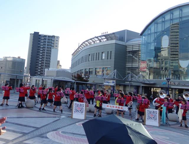 ライオン通商店街を抜けて、三越の横を通り、弁護士のみなさんがフラッグを振ってくれている香川県弁護士会館の前を通り、RNC西日本放送とヨンデンの間(金毘羅街道)を通り、玉藻公園が見えたところで左折し、公園沿いに(ジュリアン・オピーの彫刻作品を右手に見ながら)再び駅前に戻ると、今度は高松中央高校の吹奏楽部の方たちが「おかえりなさい」の演奏をしてくれていました。たまたま駅前を通りかかった方たちも含めて、大きな拍手が沸き起こっていました。