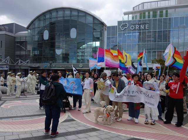 14時前、駅前広場に行くと、高松市役所の吹奏楽団の方たちが演奏していました。(浜松の駅前でこういうふうに楽団が演奏しているのを見たことがあったので)たまたま演奏する場面に出くわしたのかなと思っていたら、このパレードのためにわざわざ来て演奏してくださっているとのことで、感激しました。「ダンシング・クイーン」などLGBTQコミュニティのアンセムとなっている曲で見送ってくださいました。パラっと一瞬、雨が降ったりもしたのですが、みなさんとても晴れやかな笑顔で演奏を聴いていました。素敵なサプライズでした。
