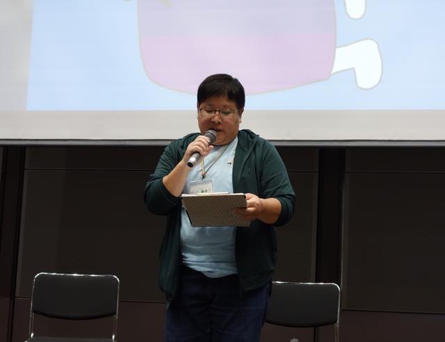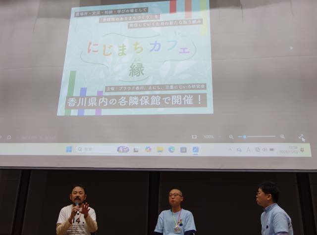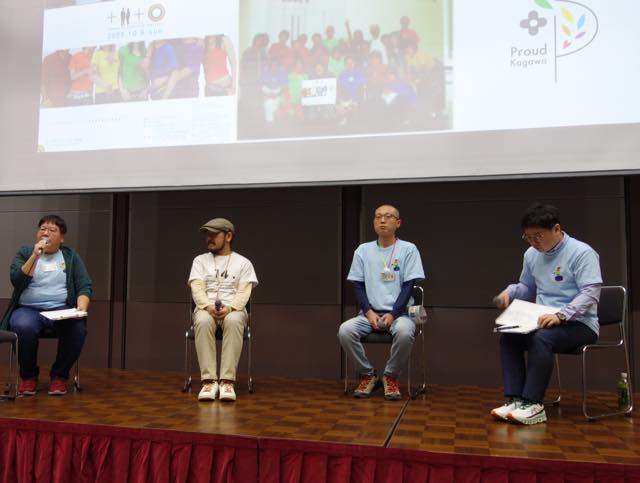 次のトークセッションは「地方の状況と当事者の居場所づくり」というテーマで、あしたプロジェクトの谷さんがモデレーターを務め、藤田さん、三豊にじいろ研究会の田中さん、えにしの大澤さんが登壇しました。藤田さんは22歳のときに女性が好きだと気づき、バイセクシュアルの女性と知り合って団体を立ち上げ、岡山のグループにも参加していて、そこが居場所だったと語りました(現在はノンバイナリー&パンセクシュアルを自認しているそうです)。田中さんは、三豊市には何もなく、プラウド香川でゲストを呼んでの勉強会があり、そこで勉強した、ハーヴェイ・ミルクにカミングアウトの意義を教えてもらったと語りました。大澤さんは初めは居場所がなかったけれども、島に移住者が増えて雰囲気が変わってきたと語りました。とても興味深かったのは、高松、三豊、小豆島それぞれにある「隣保館」という人権センターで「にじまちカフェ」というお茶会を開いて居場所づくりをしているというお話でした(地元のおじい・おばあもお茶に飲みに来ているそう)。香川はほかにも観音寺に「虹LAB」という団体があるそうです。感心したのは、谷さんの司会がとても上手かったことです。笑いもとりつつ、ソツなく、的確で。