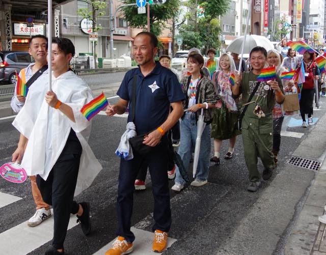 パレード中、沿道の人やパレード参加者に小さなレインボーフラッグを配ってる方がいて、沿道で応援する人がレインボーフラッグを振ってるだけでパレード参加者の方たちもパーっと笑顔になったり手を振り返したりっていうのがあって、すごくいい取組みだなぁと思ってました。で、パレードが終わってから「おつかれさまです。スタッフの方ですか?」と声をかけてみたところ、そうではなく、毎年、身銭を切って500本も用意して配ってるんだそう(頭が下がります)。JOYSTICKさんという方で、関パレには最初から参加していて(その前は東京のパレードにも参加していたそうです)、初めは歩きながらレインボーフラッグを配っていたけど、扇町公園に移ってからは、この場所でレインボーフラッグを配るようになった…けれども、還暦になるのを機に今年でこの活動を終えられるそうです。これまで本当にありがとうございました。