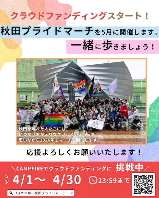 LGBTQの人権を取り戻し、あらゆる人が生きやすい秋田になるよう願って、5回目の秋田プライドマーチを開催します。それぞれのプライドを胸に、今年も皆さんと一緒に歩けますように。テーマは「ここにいるよ/We Are Here」。共感してくださるすべての皆さんとともに、秋田を行進したいと思っています。