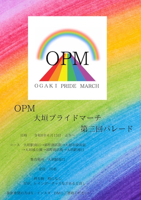 今年も大垣プライドマーチ(OPM)が開催されます。「皆様のご参加をお待ちしております! 皆様の毎日がより良いものになりますように、合言葉は?HappyPride!!」だそうです。