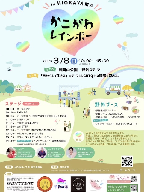 昨年初開催が予定されていたものの、残念ながら雨天のため中止となった「かこがわレインボー in HIOKAYAMA」。「自分らしく生きる」をテーマにLGBTQ+への理解を深めるためのレインボーフェスタ的なイベントです(パレードはありません)。近隣の方、日岡山公園にお出かけしてみてはいかがでしょうか。