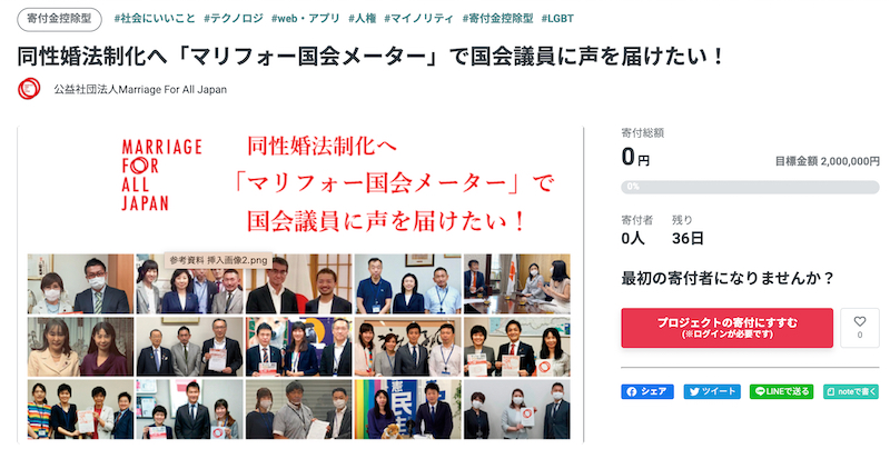 同性婚法制化へ「マリフォー国会メーター」で国会議員に声を届けたい!(クラウドファンディング)