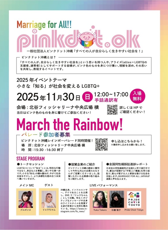 2025年のピンクドット沖縄は11月30日(日)12:00-17:00、北谷町の北谷フィッシャリーナ中央広場で開催されます。メリカンビレッジの少し北、ヒルトン沖縄北谷リゾートの目の前です。「小さな知るが社会を変える」をテーマに、ブルボンヌさんやゲイのインフルエンサー・リョウちゃん、Yuka Takaraさんや石嶺聡子さんをゲストに迎え、ライブやトークセッション、そして15:30からはパレードも行ないます。