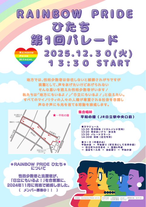 日本では気候の関係で現在、春〜6月(プライド月間)と秋頃にプライドパレードが集中しています。今年のプライドシーズンもこれで終わり(和歌山と沖縄が最後)…かと思いきや、12月30日に茨城県日立市でパレードが開催されるとの情報が入ってきました。茨城県北の団体「Rainbow Pride ひたち」が主催するものです。常磐線沿線の方など、ご都合よろしければぜひ。